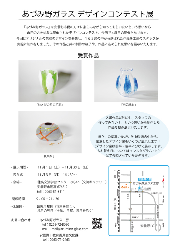 あづみ野ガラスデザインコンテスト展を穂高交流学習センターみらいにて、行います。